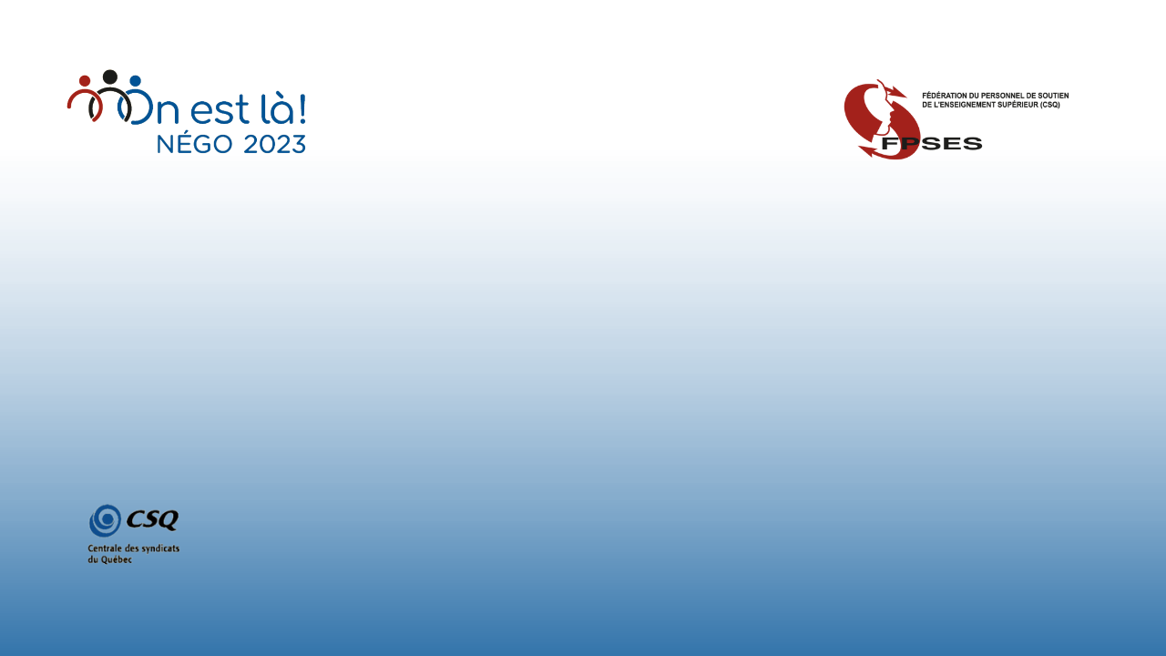 Au cours des prochains mois, cette page sera votre espace privilégié. C’est ici que vous saurez tout sur la négociation, sur nos mobilisations, nos communications et sur l’état des travaux aux différentes tables. Surveillez également nos réseaux sociaux, où nous continuerons d’être très actifs.